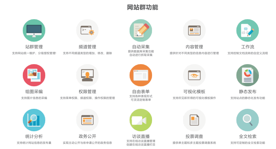全媒体网站群解决方案 新媒体时代,您需要更好的网站群内容管理解决方案,适用于政府、企业、教育、媒体、金融等各类行业网站群、内外网门户建设。主要解决现阶段面临的信息传播方式多,信息录入需要多次重复录入,管理平台不统一的核心问题。覆盖电脑、微信、微网、手机、移动客户端多种渠道。提供统一管理,一次录入,多屏、多终端、多渠道发布。