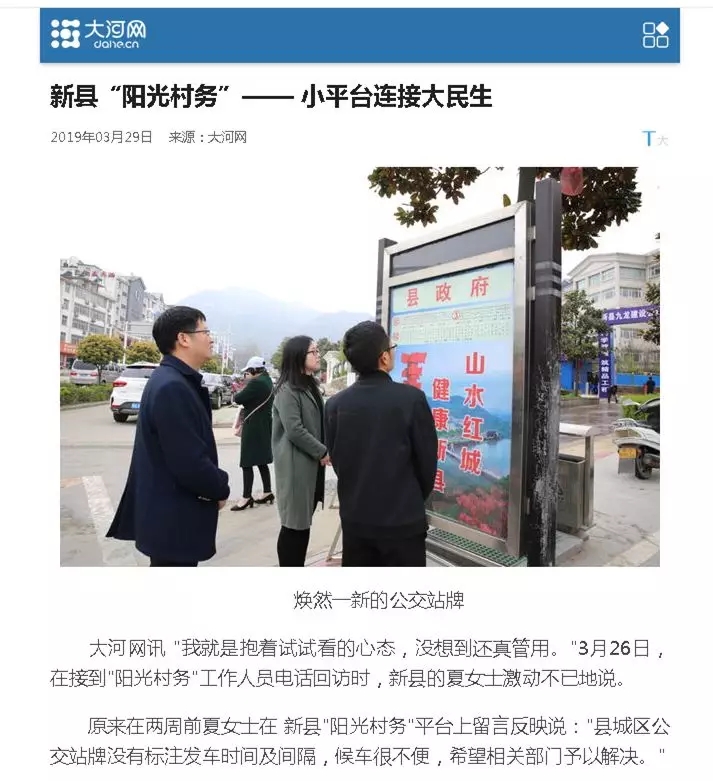 原来在两周前夏女士在 新县"阳光村务"平台上留言反映说:"县城区公交站牌没有标注发车时间及间隔,候车很不便,希望相关部门予以解决。"