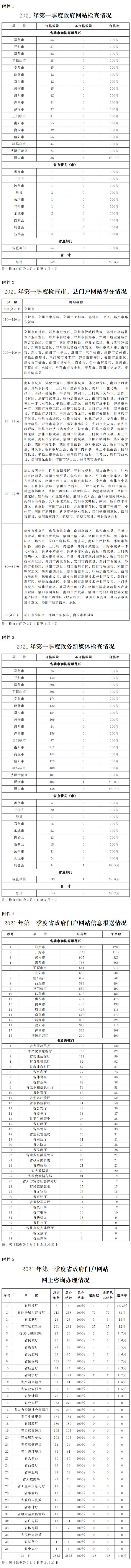 (一)总体情况。2021年第一季度,全省正在运行的政府网站共852个,检查852个,检查率100%,其中:合格849个,合格率为99.6%;不合格3个。郑州市政府门户网站得分超过120分,开封市政府门户网站和郑州市中原区、上街区、二七区、郑东新区政府门户网站得分超过110分,周口市淮阳县、漯河市临颍县、商丘市梁园区政府门户网站得分低于80分。