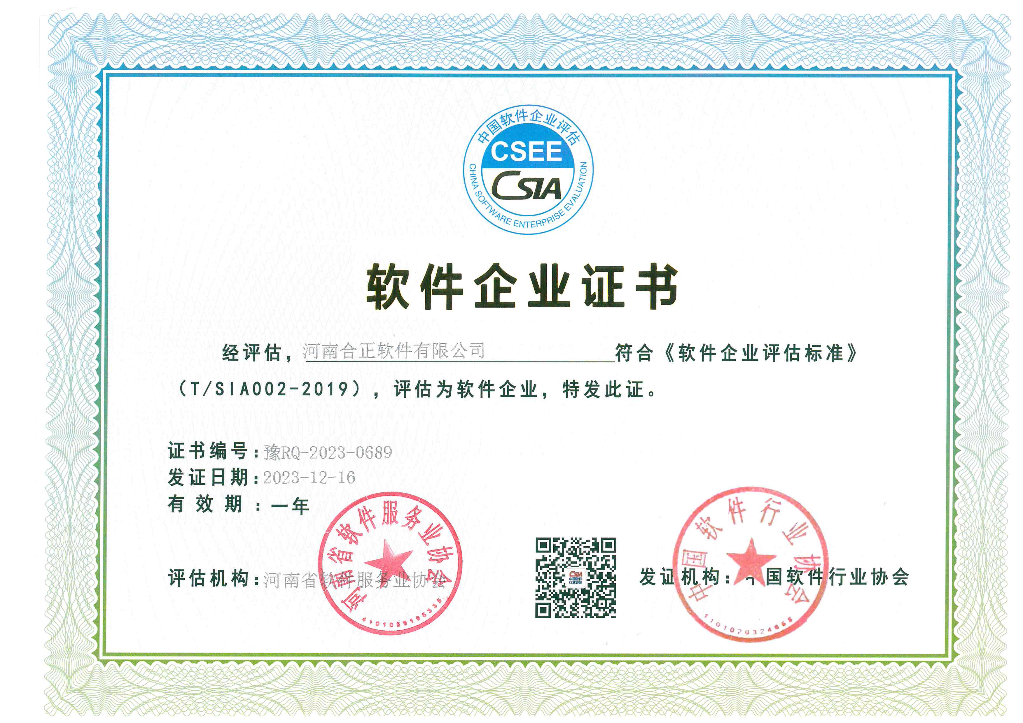 合正软件荣获2024年河南省软件企业证书